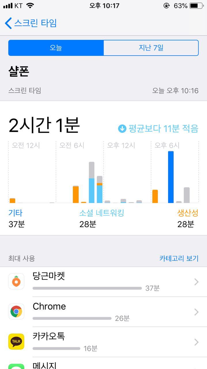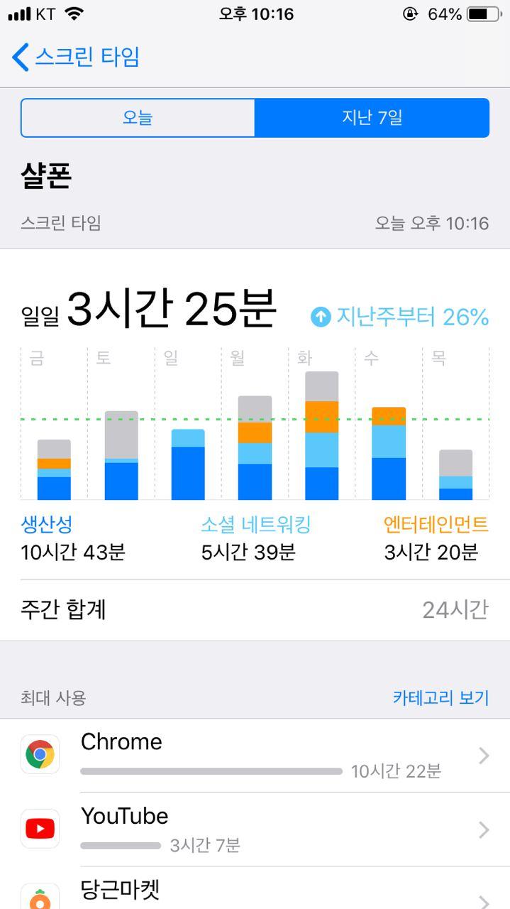 지난 7일간 내가 핸드폰 사용한 시간이다. 하루 3시간 25분, 오늘은 2시간이나 핸드폰을 사용했다. 트위터나 페이스북은 종전보다 많이 사용하지 않지만, 대신 유튜브와 커뮤니티 돌아다니기에 시간을 많이 할애하고 있다. 그러다 보니 내 개인의 발전을 위해 노력하는 시간이 점점 줄고 있다. 잠자기 전에도 누워서 30분 이상 핸드폰을 보고 일어나자마자 다시 핸드폰을 켜서 커뮤니티에 올라온 글을 읽는다. 계속 새로 고침을 하면서 새 글이 올라오길 기다릴 때도 있다.