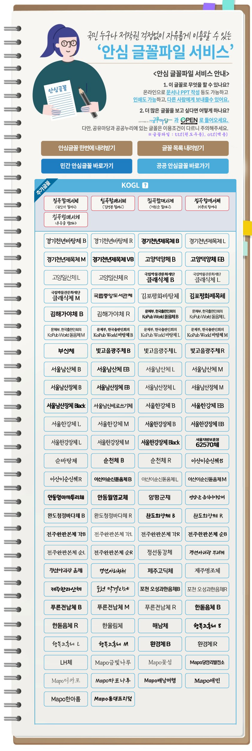 온라인, 문서, PPT, 인쇄까지 가능한 안심글꼴파일입니다. 계속해서 추가되고 있습니다.