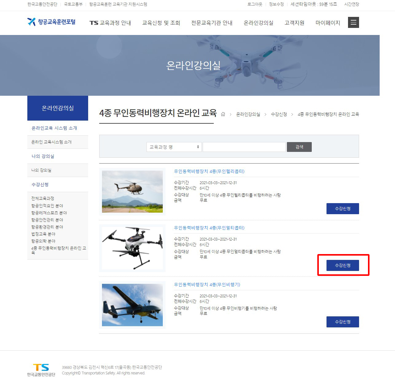 두번째 무인동력비행장치 4종(무인멀티콥터) 수강신청 버튼을 선택하세요.