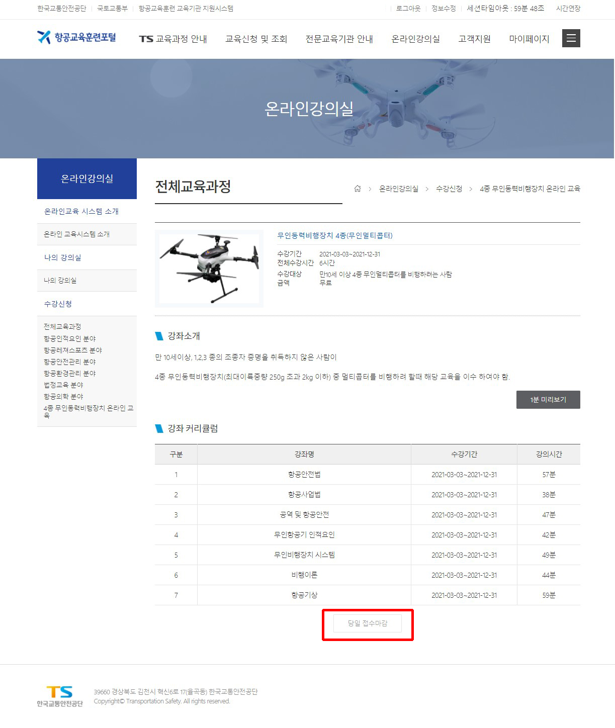 3월과는 달리 수강기간이 올 연말까지로 상당히 깁니다. 4종 무인동력비행장치 온라인교육은 동시 최대교육인원이 제한되기 때문에 수강신청 후 빠른 시일내에 수료하기를 권합니다.