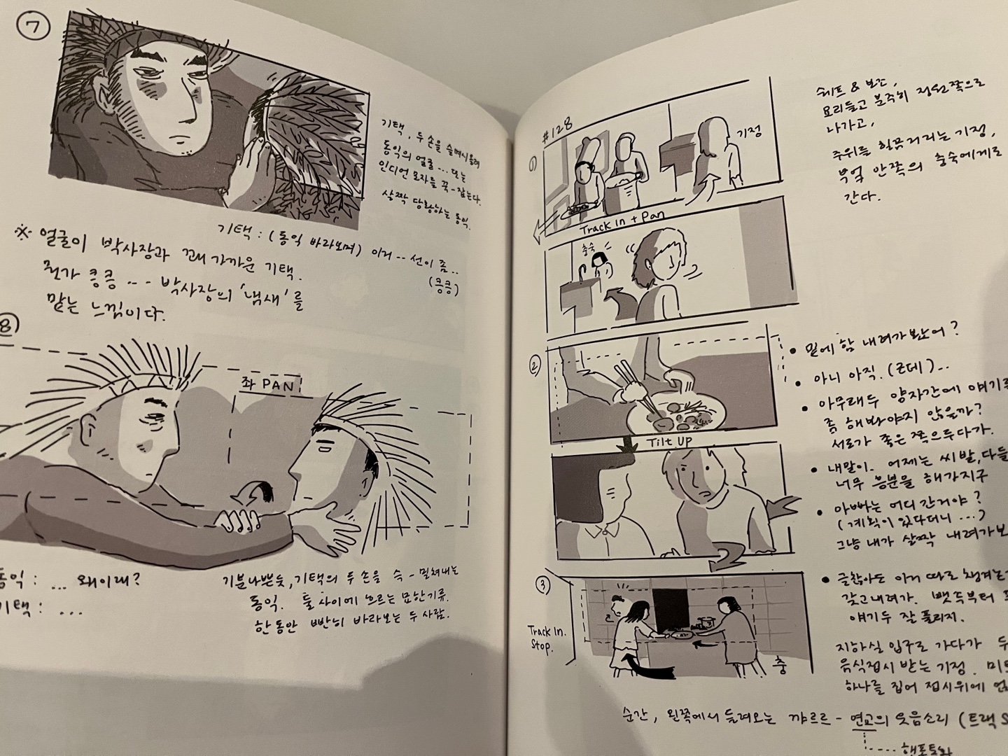 한국 영화 중 제일 큰 상을 받은 두 작품 <헤어질 결심> 스토리보드북은 전문 스토리보드 작가가 그렸고 <기생충>은 봉준호 감독이 직접 그렸다. 만화를 그렸던 사람이라 그런지 <기생충> 스토리보드북이 좀 더 입체적이고 복작복작하다. <헤어질 결심>은 작품 자체가 그래서 그런지 장면들이 잔잔하다. 둘을 비교하자면 창작자의 느낌에서 <기생충> 스토리보드가 훨씬 친근하게 느껴진다.