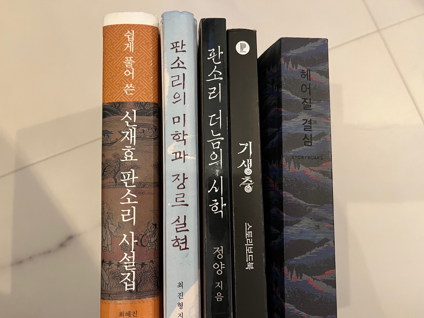 어제 새해 계획 실행을 위해 오늘 도서관에서 5권의 책을 빌렸다. 지금 그리고 있는 웹드 줄콘티에 도움을 받을 수 있는 박찬욱 감독의 <헤어질 결심>, 봉준호 감독의 <기생충> 스토리보드북을 골라왔다. 다른 카테고리로 1인극 공연을 위해 판소리 관련 책도 함께 챙겼다.